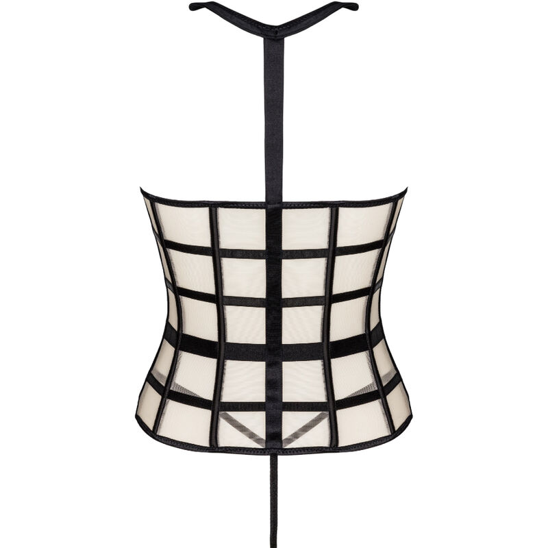 A two-piece set consisting of a sensual, busty corset and a sexy black thong. The corset has a zipper at the front, making it easy to put on. The colors of the set are black and beige, which together create an attractive combination. It is also worth paying attention to tempting details such as a black collar or black belts arranged in such a way as to best highlight the waist. What stands out most about this corset are the cutouts that expose the bust. This makes the whole set very daring and provocative. Not much is left to the imagination. Nipple stickers will be a great addition to the game and add some spice.